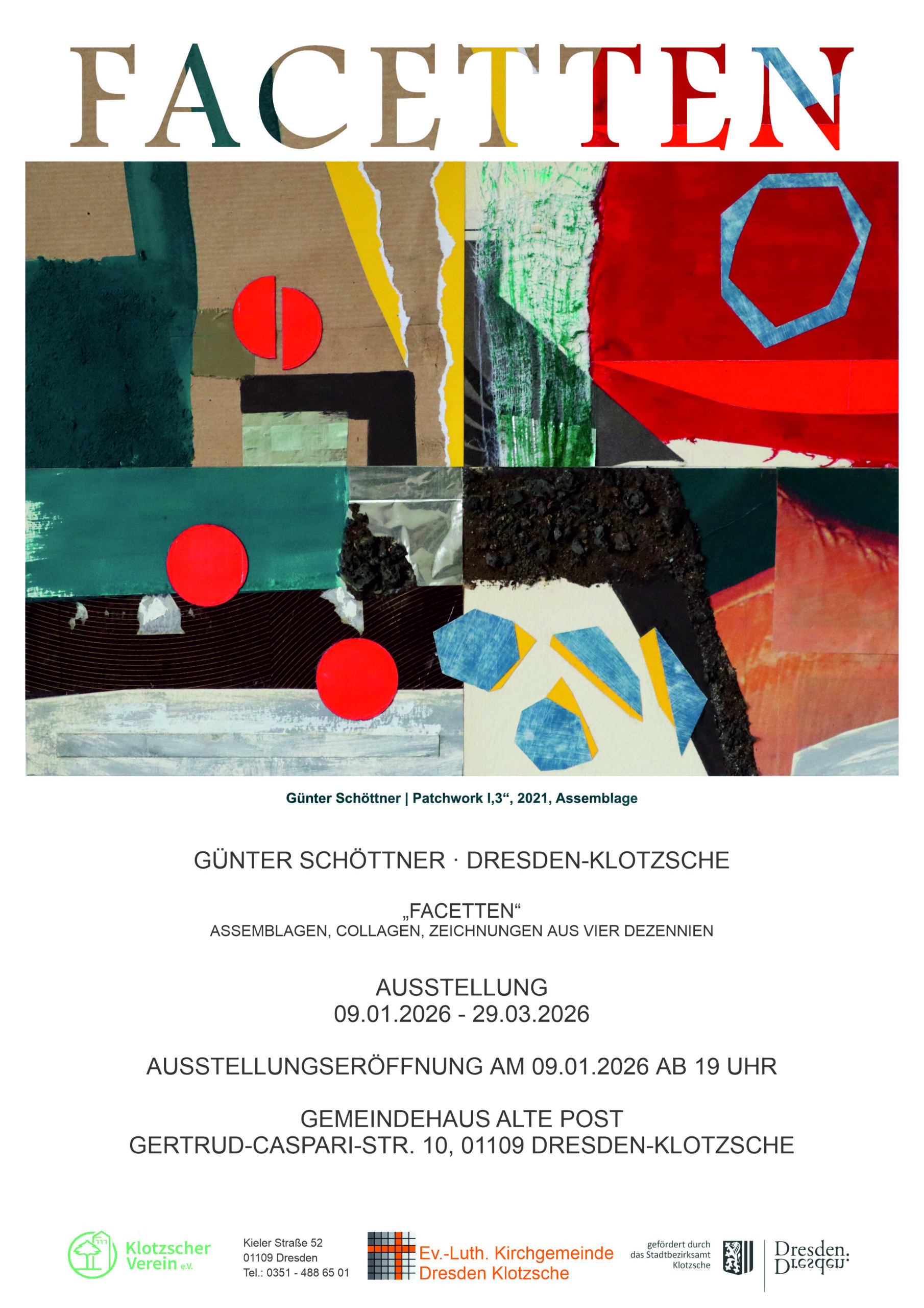 Nun werden Arbeiten des Künstlers im Gemeindehaus Alte Post (GAP), Gertrud-Caspari-Straße 10, 01109 Dresden, unter dem Titel: „FACETTEN, Assemblagen, Collagen, Zeichnungen aus vier Dezennien“ vom 09. Januar 2026 bis 29. März 2026 zu sehen sein. Die Vernissage wird am 09.01.2026 um 19.00 Uhr stattfinden.